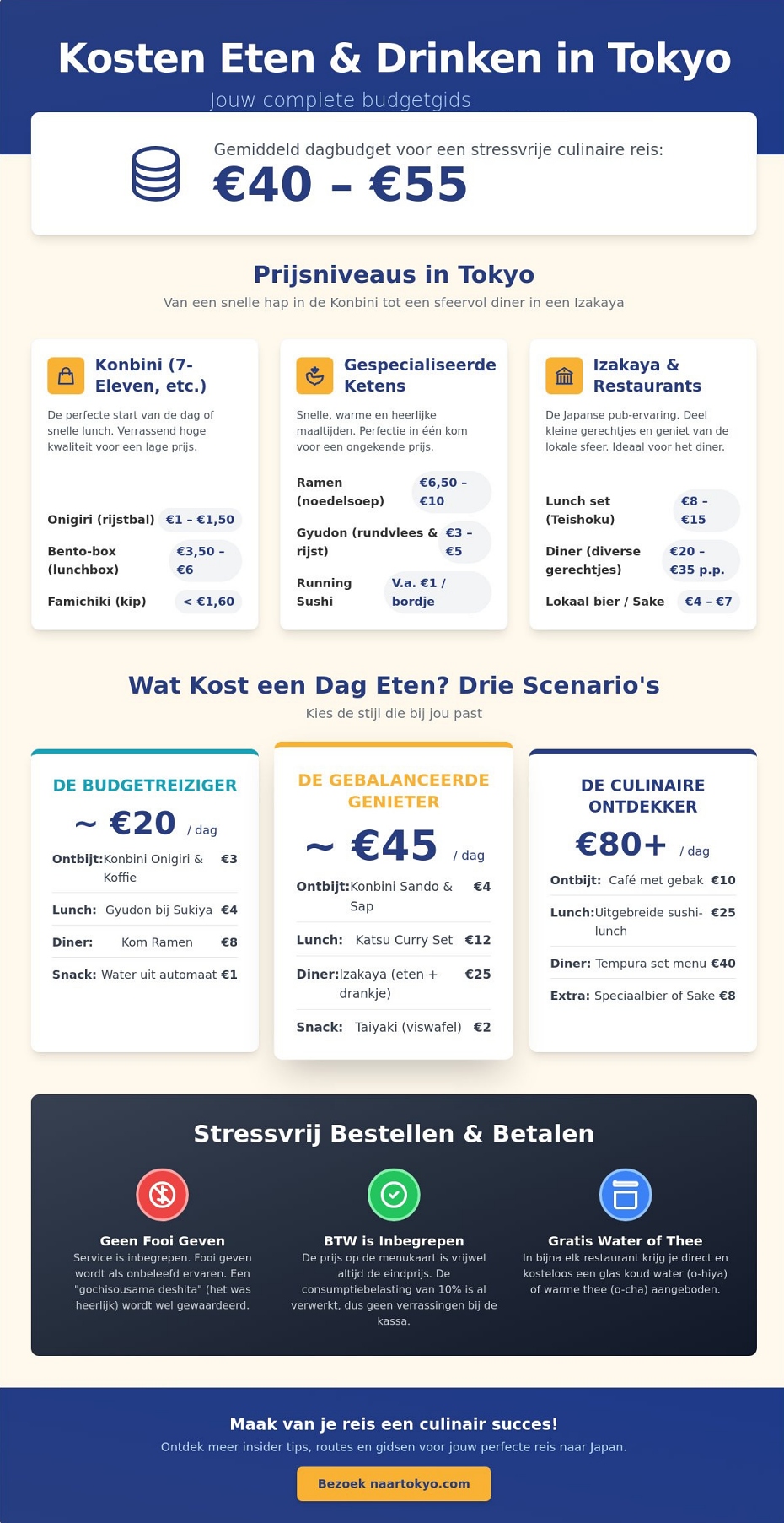 Ik geef je in dit artikel direct inzicht in wat je écht uitgeeft, van de handige konbini (7-eleven, Lawson en Family Mart) en tot de intieme izakaya. Ik beloof je dat je na het lezen precies weet hoe je met een realistisch dagbudget van ongeveer €40 tot €55 stressvrij kunt genieten. We kijken naar de beste prijs-kwaliteitverhouding en ik deel mijn persoonlijke ervaringen om zelfverzekerd elk restaurant binnen te stappen.